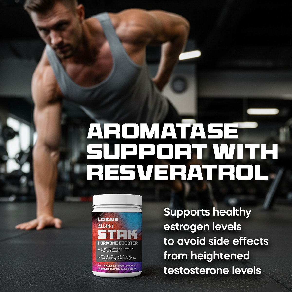 Aromatase Combating Complex that includes, Resveratrol, DIM and calcium D-glucarate, and may help support healthy estrogen levels so you don’t experience side effects related to heightened testosterone levels.